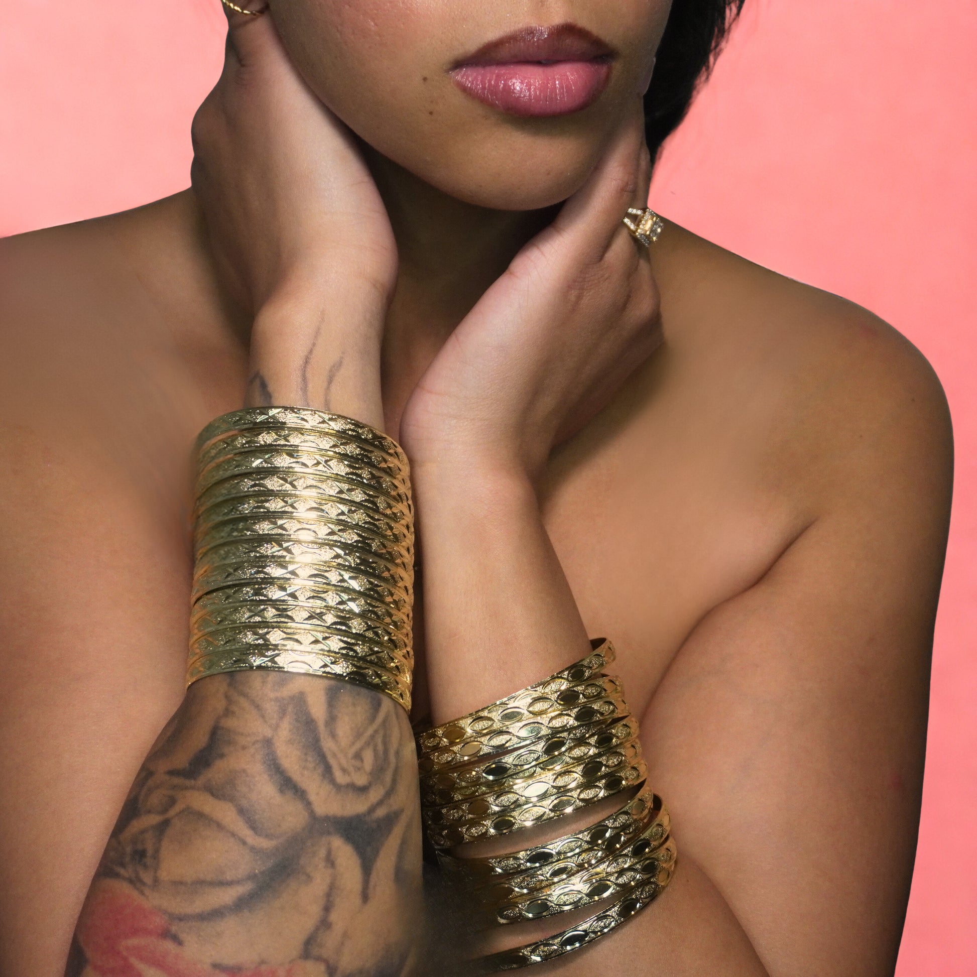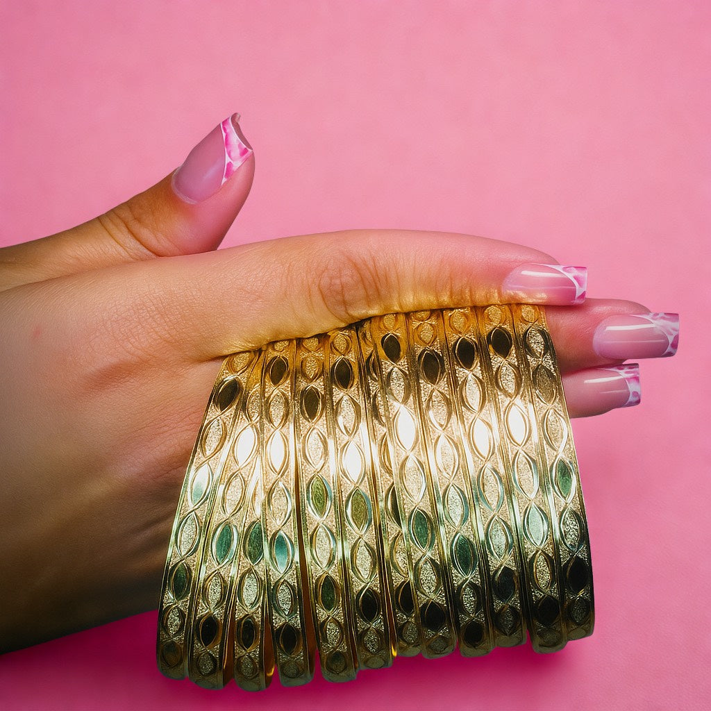 Add a touch of timeless elegance to your jewelry collection with this set of 12 18K gold-plated bangles. Designed for both everyday wear and special occasions, these bangles offer a classic style that pairs effortlessly with any outfit.